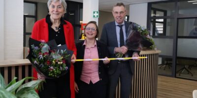 Foto: (v.l.n.r.): wethouder Erianne van der Burg, mevrouw Moerman (terugkerende bewoner) en Laura Broekhuizen (Groninger Huis) onthullen het bouwbord.